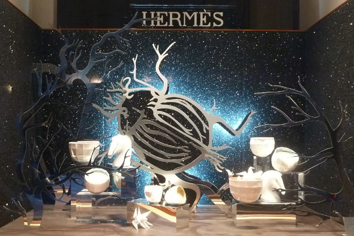 К Рождеству практически все известные бренды стараются разработать оригинальные рекламные кампании. Hermès в своих магазинах изобрела необычное оформление витрин. Каждая из них была оснащена фоном, темно-синим, с россыпью мерцающих точек. Такая имитация звездного неба выглядит и стильно, и довольно живописно.