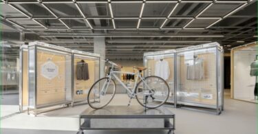 Книги рассортированы по темам, а не в соответствии со стандартными категориями. Некоторые издания дополнительно представлены на столах, изготовленных из того же материала, что и стеллажи. Зеркальный потолок визуально удваивает объём. Оригинальные светильники и разноплановые стулья делают дизайн ещё более непринуждённым.